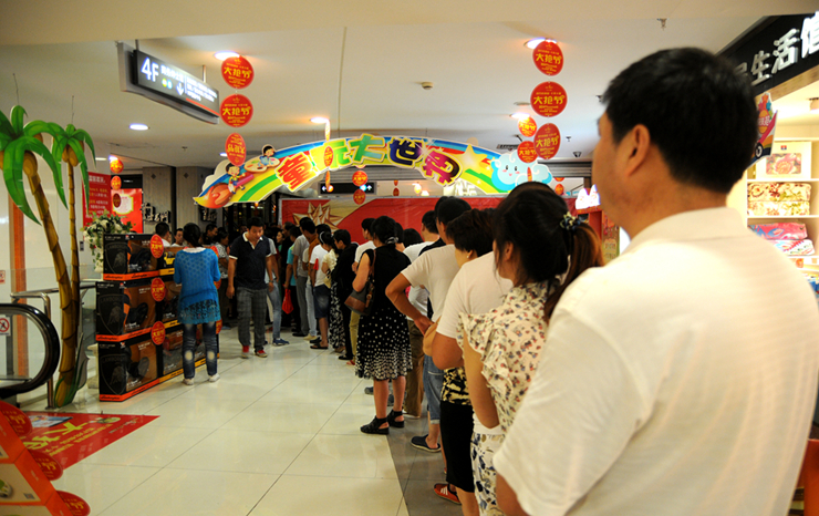 晚上7時(shí),華億國際A、B座同時(shí)打開大門,排隊(duì)的人群如泄洪的江水一樣,涌進(jìn)華億國際購物中心,原本寬敞的過道瞬間變得擁擠起來,仿佛一場(chǎng)萬人馬拉松賽起跑時(shí)的場(chǎng)景。進(jìn)入商場(chǎng)的市民迅速奔向目標(biāo)專柜,火速搶購超值商品。從開門到排隊(duì)客流全部進(jìn)入商場(chǎng)持續(xù)了近十分鐘。