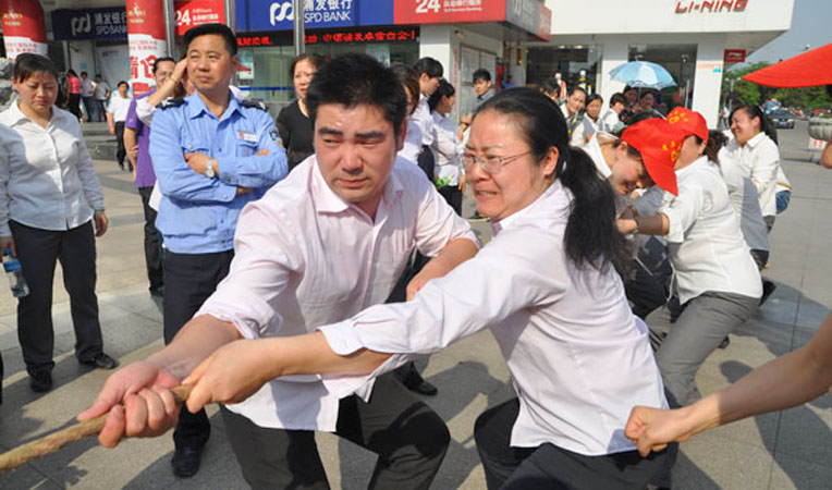 比賽的哨聲一響起,各隊隊員們雙手緊握長繩,憋足了勁拼命往后拉,他們的“粉絲們”自發組成啦啦隊,口中一起高呼著“加油,加油”為各個隊伍加油鼓勁。號子聲、吶喊聲,此起彼伏,飄蕩在華億國際的上空。歡騰的場面,感染了步行街上的眾多行人,商場的顧客朋友也紛紛出來駐足觀看,現場感受華億國際的文化氛圍。整場比賽氣氛熱烈,秩序井然,展示了良好的組織能力和水平。經過激烈的較量,最終運動休閑部獲得冠軍,后勤機關隊獲得亞軍,皮鞋皮具部獲得季軍,珠寶、化妝、床品兒用、男裝、女裝五隊得到了優勝獎.